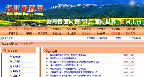 | Ø 保山教育网政务公开等栏目 通过保山教育网政务公开栏目,可以了解教育局机构设置,工作职责,政策法规,可在第一时间查看相应的通知公告,同时也可以在文件中心下载相关文件。  图4. 保山教育网政务公开 Ø 保山市中考查分管理系统 2012年,保山市初中三年级学生可通过两种方法在网上查询学业水平考试成绩。 方法一:登陆保山市教育网:http://www.bssjyw.cn,在首页中间,运用导航栏,点击“考试成绩查询”,输入考生的准考证号查询。 方法二:直接登录网址:http://www.bssjyw.cn:8080/,输入考生的准考证号查询。 通过网上中考查分管理系统,学生们在家里面就可以第一时间查询到自己成绩,更方便地进行成绩折算。 |